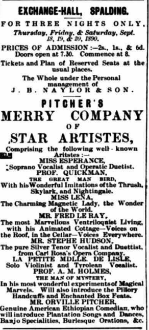 [45] Lights and Shades Combination Company: ‘Public Notices: Shodfriars’ Hall, Boston’, Boston Independent and Lincolnshire Advertiser, 06 September 1884.