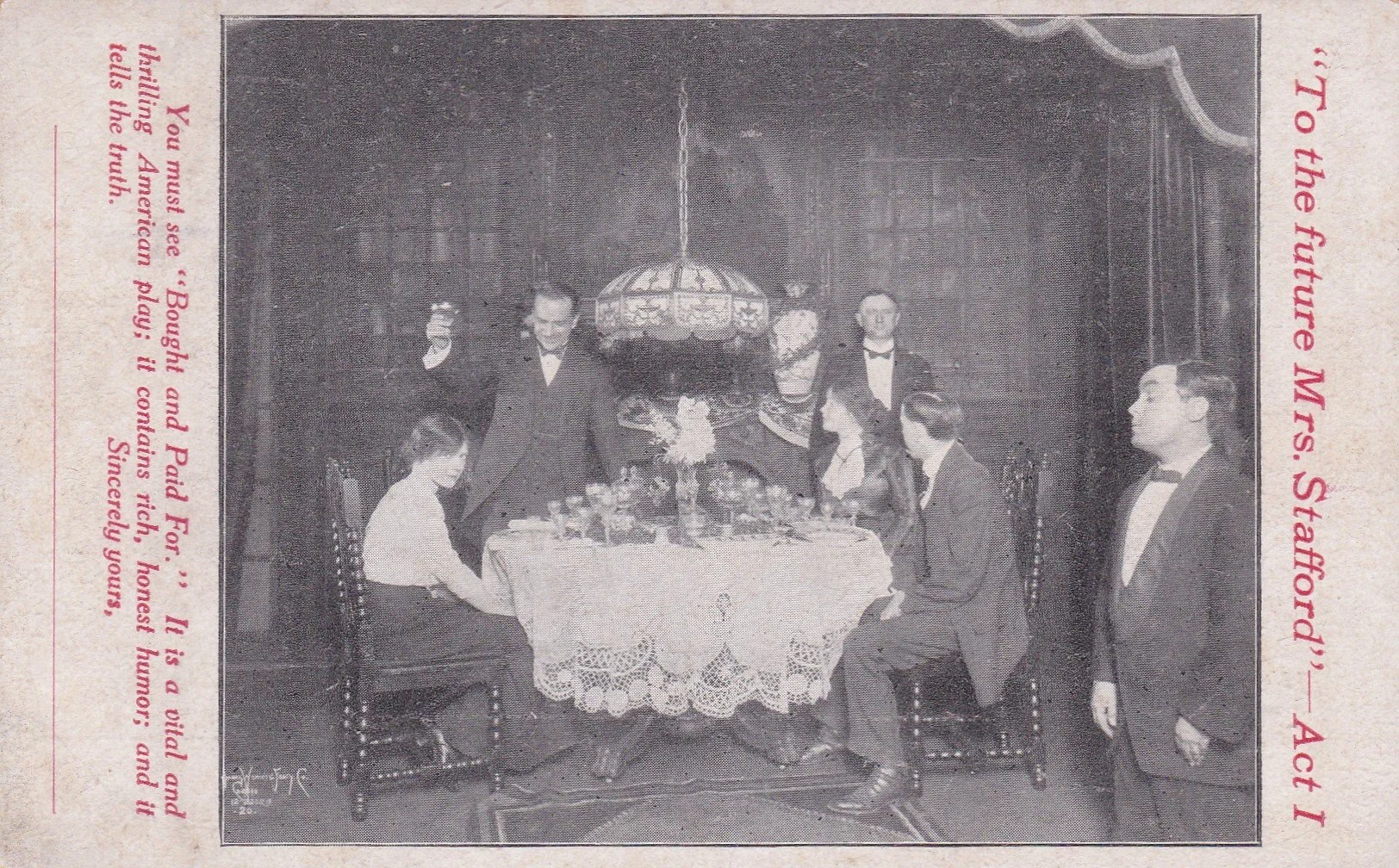 A scene from 'Bought and Paid For', 1912, postcard. Author's own collection.